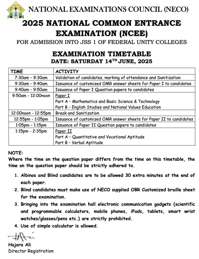 NCEE 2025 Common Entrance Exam Timetable for Unity Schools; The National Examinations Council (NECO) has announced that the 2025 National Common Entrance Examination (NCEE) into Junior Secondary School 1 (JSS 1) in Federal Unity Colleges will hold on Saturday, 14 June 2025.