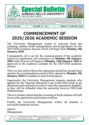 ABU Announces Commencement of 2025/2026 Academic Session; The University Management has officially announced the start of the 2025/2026 academic session, welcoming both new and returning undergraduate and postgraduate students.