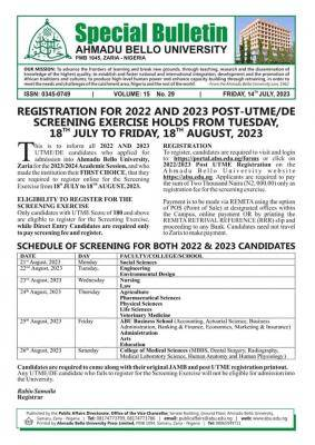 ABU Zaria Releases 2022 & 2023 Post-UTME/DE Forms; Ahmadu Bello University, Zaria, has released the registration details for the Post-UTME/DE screening exercise for the 2022/2023 and 2023/2024 academic sessions.