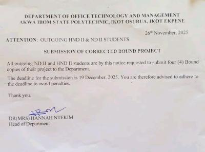 Akwa Ibom State Polytechnic Announces Project Submission Deadline for Outgoing Students; All outgoing ND II and HND II students of the Akwa Ibom State Polytechnic are required to submit four (4) bound copies of their final year projects to their respective departments.