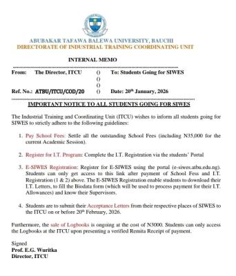 ATBU ITCU Notice to Students Proceeding for SIWES; The Industrial Training and Coordinating Unit (ITCU) has issued an important notice to all students of Abubakar Tafawa Balewa University (ATBU) who are preparing to proceed for the Students’ Industrial Work Experience Scheme (SIWES). All affected students are advised to strictly comply with the following guidelines.