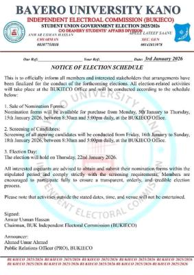 BUKIECO has advised all interested aspirants to obtain and submit their nomination forms within the stipulated timeframe and to strictly comply with all screening requirements. The commission also encouraged students and relevant stakeholders to participate actively to ensure a transparent, orderly, and credible election process.