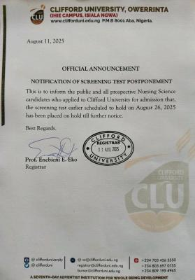 Clifford University Postpones Nursing Science Screening Test; Clifford University wishes to inform the public and all prospective Nursing Science candidates who applied for admission that the screening test, earlier scheduled to hold on Tuesday, August 26, 2025, has been postponed until further notice.