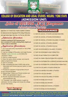 College of Education and Legal Studies Nguru Releases NCE Admission Form for 2025/2026; Applications are invited from suitably qualified candidates for admission into the Nigeria Certificate in Education (NCE) Programme of the College of Education and Legal Studies, Nguru, Yobe State for the 2025/2026 academic session.