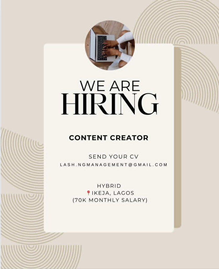 Interested candidates should send their CV to lash.ngmanagement@gmail.com with the subject line “Content Creator – Ikeja.” Include a portfolio or links to previous work (e.g., social media posts, articles, or videos) and a brief cover letter highlighting your passion for content creation. Applications will be reviewed promptly, and shortlisted candidates will be contacted for interviews.