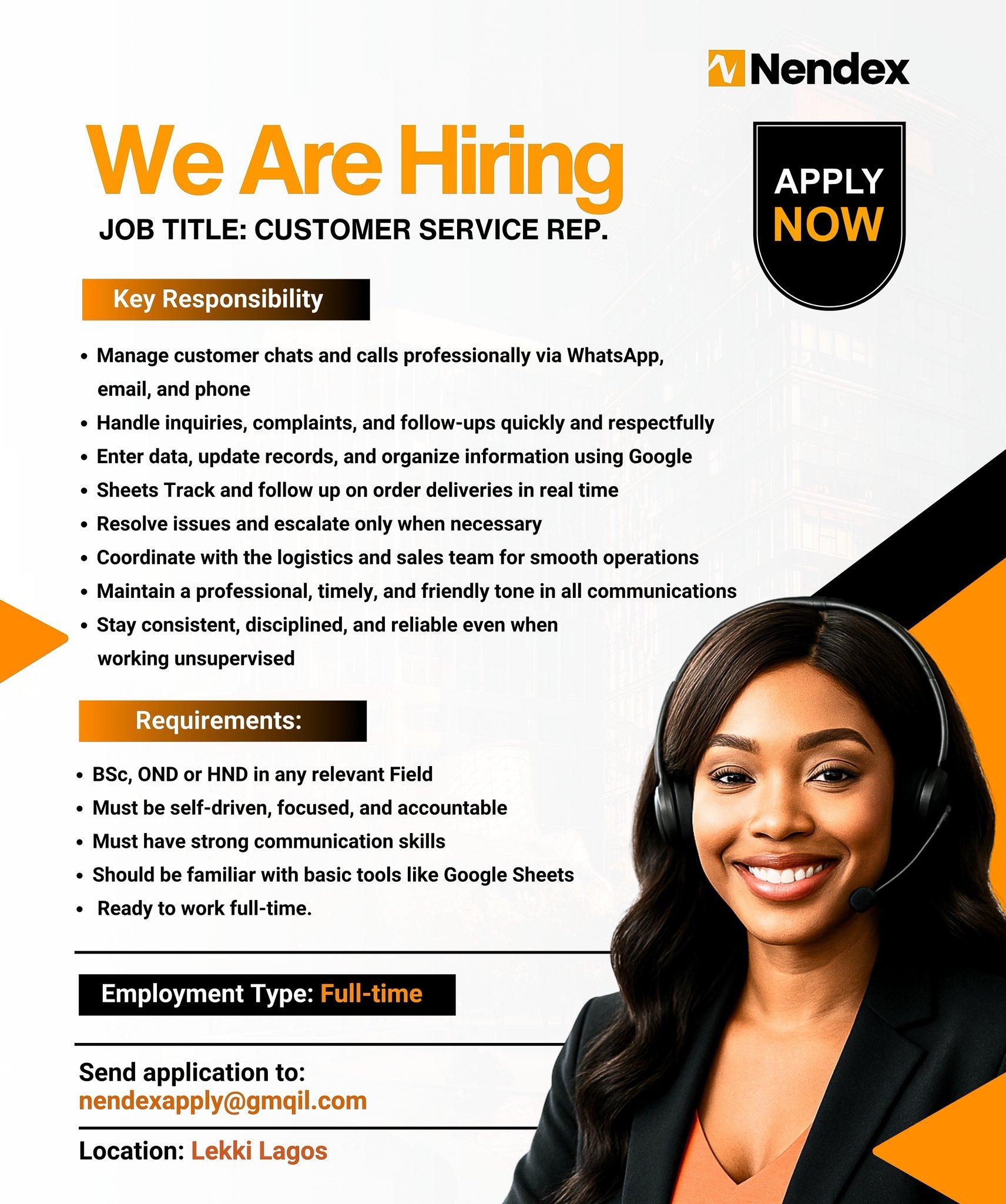 Qualified candidates should send their applications to [nendexapply@gmail.com], using “Customer Service Representative” as the subject line.