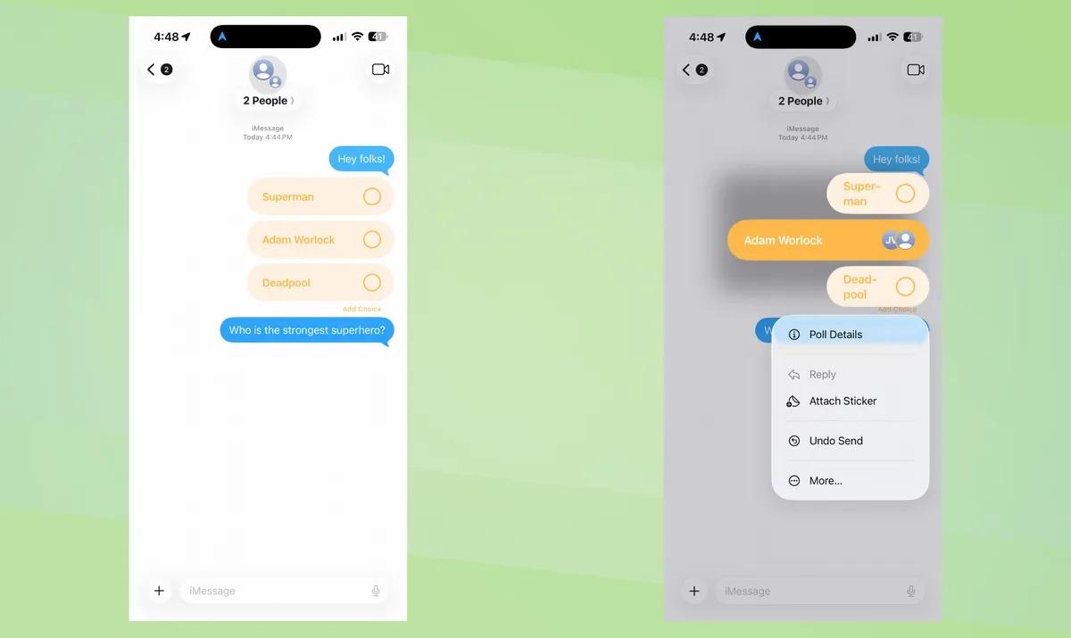 The Messages app now includes a built-in polling tool. Create quick polls in your chats, and participants’ avatars appear alongside their votes. If the existing options don’t cover everything, you can add new choices on the fly.4. Visual Intelligence for Screenshots