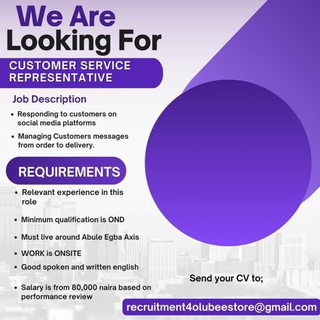 Send your CV to 👉 recruitment4olubeestore@gmail.com