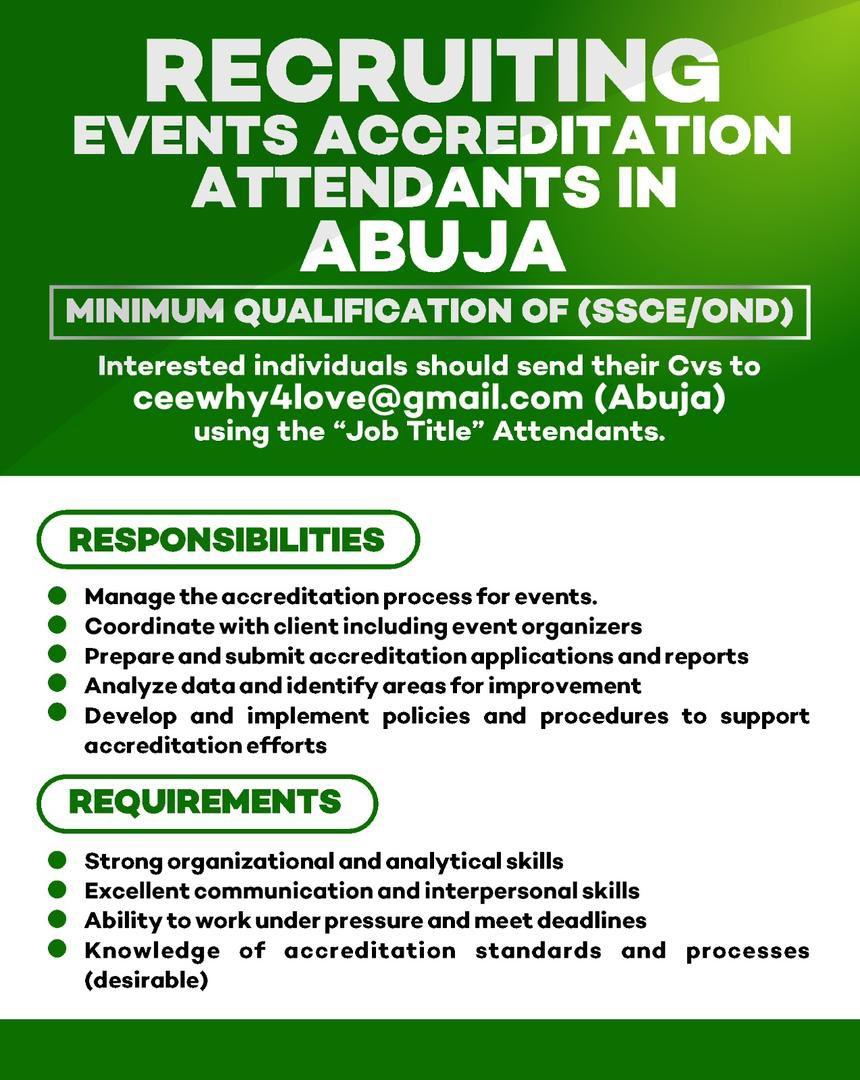 Send your CV to ceewhy4love@gmail.com with the subject line: Attendants.