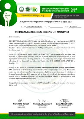 FUOYE SUG Notice to Freshers on Medical Screening for 2025/2026 Academic Session; As the 2025/2026 academic session begins, the Students’ Union Government (FUOYESUG) is committed to making the transition from aspirants to full-fledged students seamless and stress-free. The Better Days Cabinet has assured new students of full support — from accommodation and registration to medical screening, and even safeguarding them from individuals who may try to take advantage of them financially or otherwise.