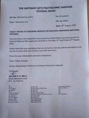 Gateway ICT Polytechnic ND Screening Exercise 2025/2026; The management of Gateway ICT Polytechnic, Sapaade wishes to inform the Polytechnic community and all prospective applicants that the 2025/2026 screening exercise for National Diploma (ND) candidates has been scheduled as follows: