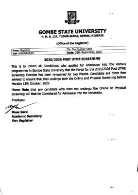 - Any candidate who fails to undergo either the online or physical screening will not be considered for admission into Gombe State University for the 2025/2026 academic session.