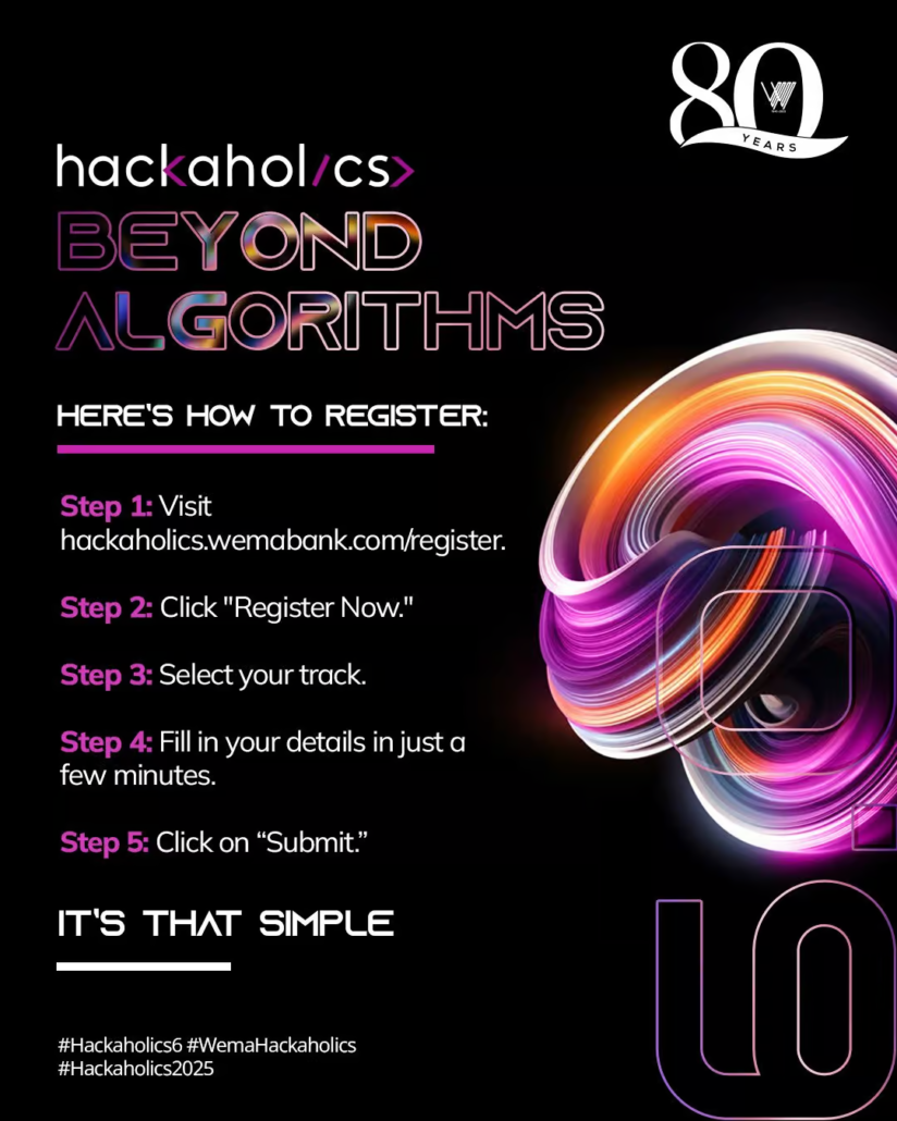 Join 2025 Hackaholics 6.0 by WEMA Bank; Are you a coder, startup founder, or someone with a game-changing tech idea? Hackaholics 6.0, powered by WEMA Bank, is back—and this year’s edition is bigger, bolder, and open to innovators across Africa.