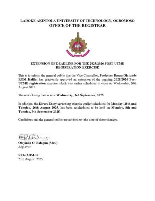 LAUTECH Extends Post-UTME/DE Registration Deadline for 2025/2026; The management of Ladoke Akintola University of Technology (LAUTECH) wishes to inform the general public that the Vice Chancellor, Professor Rasaq Olatunde Rom Kalilu, has approved the extension of the ongoing 2025/2026 Post-UTME registration exercise.