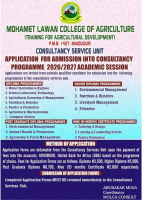 MOLCA Begins Consultancy Programme Admissions for 2026/2027 Academic Session; Mohamet Lawan College of Agriculture (MOLCA), Maiduguri, has announced the commencement of applications for admission into its Consultancy Service Unit programmes for the 2026/2027 academic session.