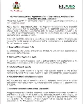 NELFUND announces closure of 2024/2025 application; Abuja, Nigeria – September 29, 2025 – The Nigerian Education Loan Fund (NELFUND) has officially announced that the application portal for the 2024/2025 academic session will close on Tuesday, September 30, 2025. This closure marks the end of the second full cycle of the loan scheme and will allow the Fund to finalize pending applications and manage upkeep payments.