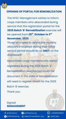 Additionally, corps members who previously registered during the 2025 Batch “A” Remobilization Exercise but were unable to complete documentation in their assigned state of remobilization must register afresh for the 2025 Batch “B” Remobilization Exercise.