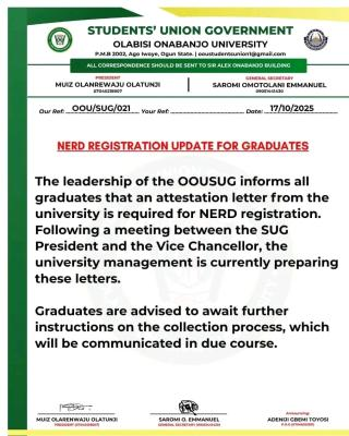 OOU SUG Issues Important Notice to Graduates on NERD Registration. The Students’ Union Government (SUG) of Olabisi Onabanjo University (OOU) has announced that all graduates of the institution are now required to obtain an attestation letter from the university as part of the NERD registration process.
