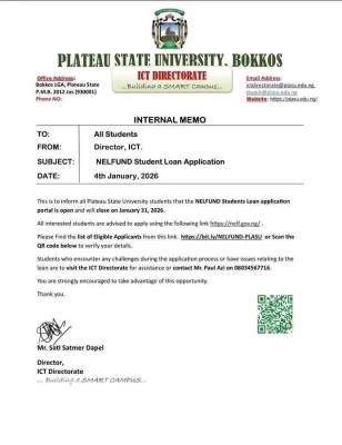 PLASU Opens NELFUND Application Portal for 2026 Academic Cycle; The Directorate of Information and Communication Technology (ICT) at Plateau State University (PLASU), Bokkos, has officially announced the opening of the Nigerian Education Loan Fund (NELFUND) application portal for the 2026 academic cycle.