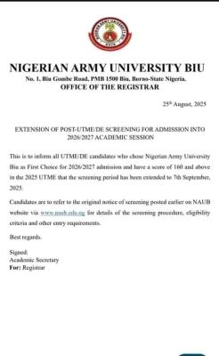 NAUB Extends Post-UTME Application Deadline 2026/2027; This is to inform all UTME/DE candidates who chose Nigerian Army University Biu (NAUB) as […]