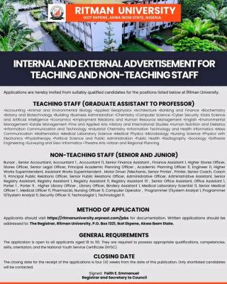 Ritman University Announces Teaching and Non-Teaching Staff Vacancies; Applications are hereby invited from suitably qualified candidates for teaching and non-teaching positions at Ritman University. The university is seeking competent professionals to fill various academic and administrative roles.