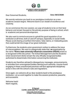 Addressing recent misconceptions, the Union clarified that there is no recognized organization within the university known as the “Rivers State University Influencers Association (RSUIA)”. It reiterated that only the School Management and the SUG are authorized to release official information on behalf of the institution.