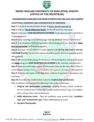 SSUES registration guidelines for 2025/2026 Fresh Students; Shehu Shagari University of Education, Sokoto (SSUES) has officially released the guidelines for Acceptance, Screening, and Confirmation of Admission for all newly admitted students for the 2025/2026 academic session. Candidates are required to follow the step-by-step procedure on the University Students Portal to complete their admission confirmation.