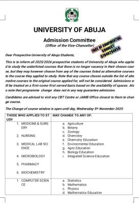 UNIABUJA Issues Important Notice on Change of Course for 2025/2026 Admission Candidates; The Admission Committee of the University of Abuja (UNIABUJA) has released an important notice to all 2025/2026 prospective students who applied for programmes that are already filled up.