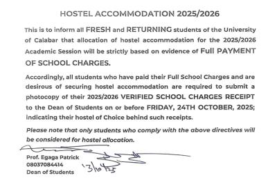 UNICAL Announces Hostel Allocation Guidelines for 2025/2026 Academic Session; The University of Calabar (UNICAL) has released an important notice regarding hostel accommodation for the 2025/2026 academic session. According to the announcement, the allocation of hostels will be strictly based on evidence of full payment of school charges.