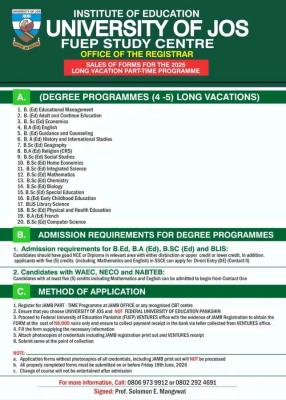 UNIJOS Sales of Forms for the 2026 Long Vacation Part-Time Programme; The University of Jos, through the Office of the Registrar in collaboration with the FUEP Study Centre, has invited applications from suitably qualified candidates for admission into various degree programmes for the 2026 Long Vacation Session.