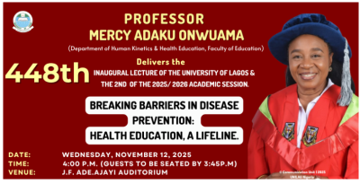 UNILAG’s 448th Inaugural Lecture holds Nov. 12; The University of Lagos (UNILAG) is set to host its four hundred and forty-eighth (448th) Inaugural Lecture and the second (2nd) of the 2025/2026 Academic Session on Wednesday, November 12, 2025.