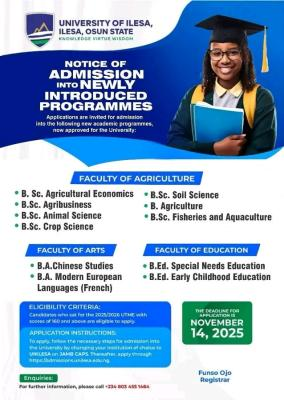 UNILESA Announces Admission Into Newly Approved Programmes for 2025/2026; The management of the University of Ilesa, Osun State, has officially announced the commencement of admission into several newly introduced academic programmes for the 2025/2026 academic session.