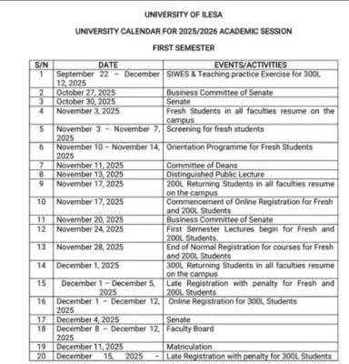 UNILESA Releases Approved Academic Calendar for 2025/2026 Academic Session; The management of the University of Ilesa (UNILESA) has officially released the approved academic calendar for the 2025/2026 academic session. All students are advised to take note of the important dates and activities outlined below.