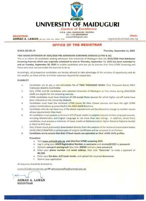 UNIMAID Extends Post-UTME Registration Deadline for 2025/2026 Academic Session; The University of Maiduguri (UNIMAID) has announced the extension of its 2025/2026 Post-Admission Screening Exercise. The exercise, which was initially scheduled to close on Thursday, September 11, 2025, will now end on Tuesday, September 30, 2025.