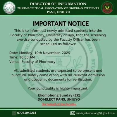 UNIUYO Faculty of Pharmacy Schedules Screening for Newly Admitted Students; The Pharmaceutical Association of Nigerian Students (PANS), University of Uyo, has announced the screening exercise for all newly admitted students into the Faculty of Pharmacy for the 2025/2026 academic session.