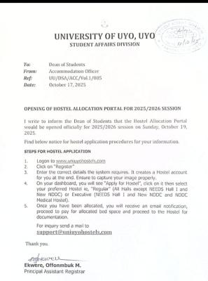UNIUYO Opens Hostel Allocation Portal for 2025/2026 Session; The University of Uyo (UNIUYO) has officially announced the opening of its Hostel Allocation Portal for the 2025/2026 academic session.