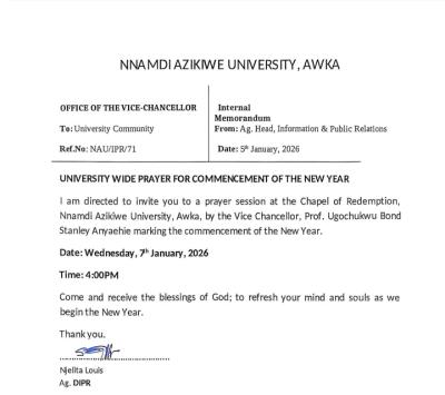 UNIZIK Invites University Community to Special Prayer Session for New Year 2026; The Nnamdi Azikiwe University (UNIZIK) community has been invited to a special prayer session to mark the commencement of the New Year 2026.