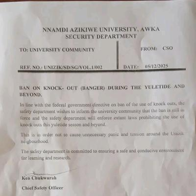 UNIZIK Security Department Enforces Strict Ban on Knock-Outs During Yuletide Season and Beyond; The Security Department of Nnamdi Azikiwe University (UNIZIK), Awka has issued a strict directive reaffirming the complete ban on the use of knock-outs (bangers) within the university community. The prohibition takes effect immediately and will remain in force throughout the Yuletide season and indefinitely beyond.
