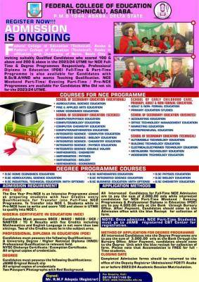 FCE (Technical) Asaba & affiliates releases 2023/2024 admission form; Federal College of Education Technical, Asaba, and its affiliation with the University of Benin, Benin City, are excited to announce the admission opportunities for the 2023/24 academic session.