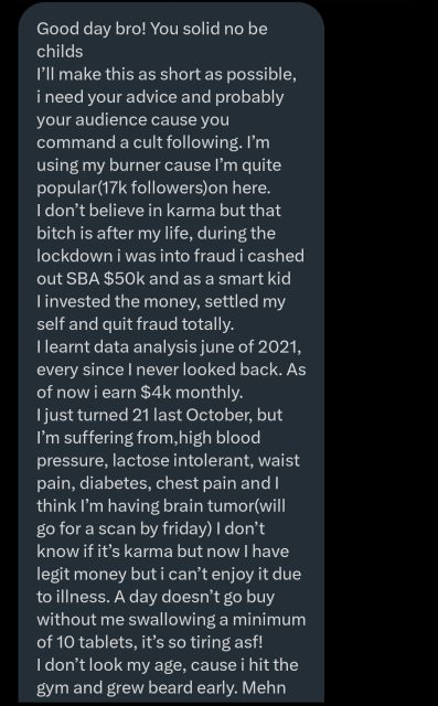Student Village Academy › Forums › GENERAL DISCUSSIONS › He earns $4k monthly but can’t enjoy his money due to recurring sickness. He doesn’t know if it is karma for fraud he did.