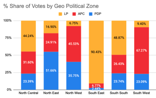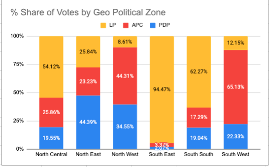 LP is leading in North Central, South East and South South. APC is leading in South West and North West. PDP is leading in North East