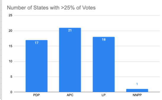 justseyiKeymasterHowever APC has the most states with 25% or more votes (21), followed by LP at 18 and PDP at 17